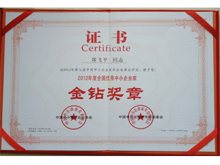 2012年度全國(guó)優(yōu)秀中小企業(yè)家。被授予2012年第七屆中國(guó)中小企業(yè)家年會(huì)金鉆獎(jiǎng)?wù)?