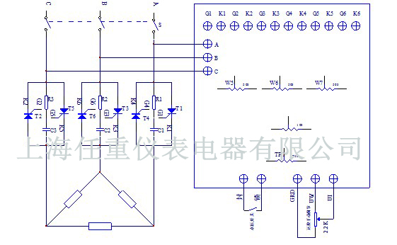 3、 接線時要按相位順序接入三相電源時,裝置的相應(yīng)必須和主電路的相應(yīng)一致。裝置的脈沖輸出分別接晶閘管的控制極Ga ;Gb ;Gc和Ka; Kb ;Kc。裝置的輸入端在輸出為0~10mA、4~20mA或0~10V、1~5V控制儀表上,正負(fù)極不能接錯。